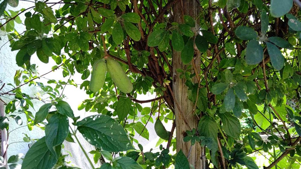 家にもアケビの木ががあります花がいっぱい咲いていたのにたった1つだけ実がなりました、まだ青いけど楽しみです