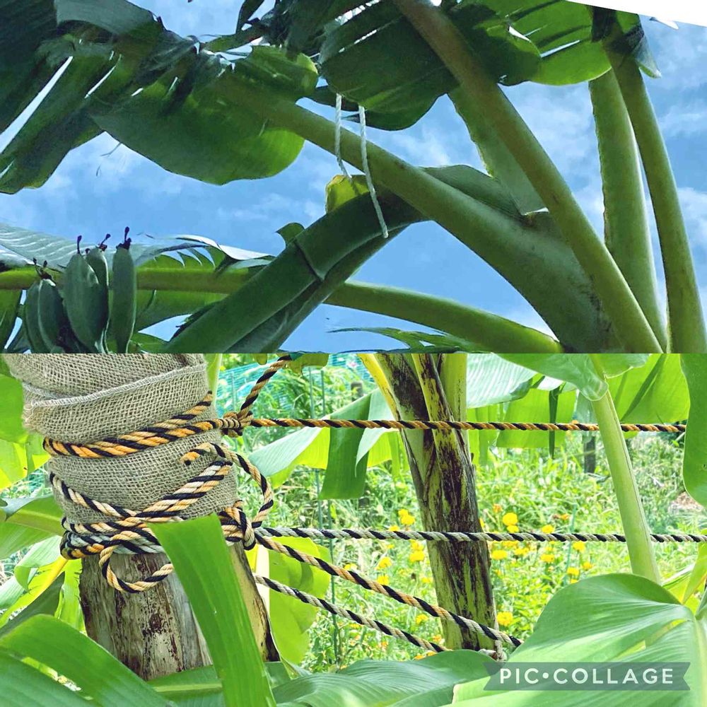 台風の強風の影響でバナナが倒れてきてしまいました‼️近所の方に手伝ってもらって、庭の薪の木とベランダとで紐で結び応急処置。😅