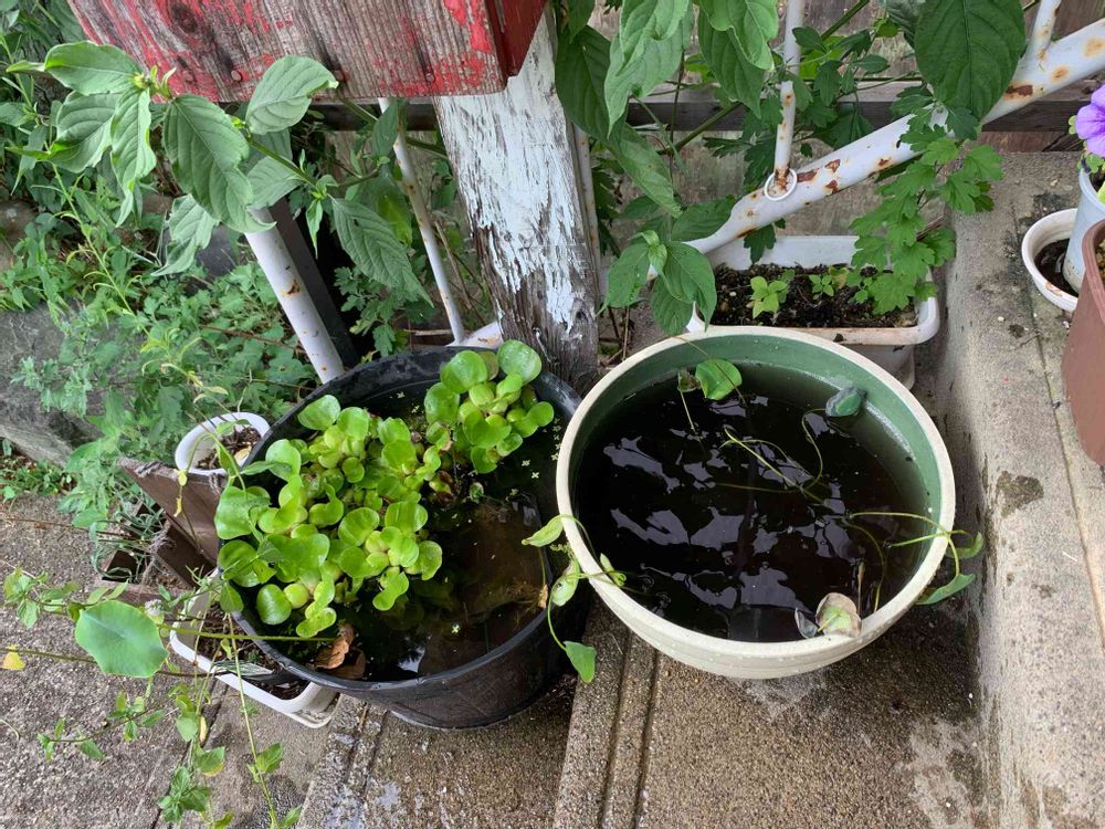 左の鉢はホテイアオイと一冬越したコウホネ。