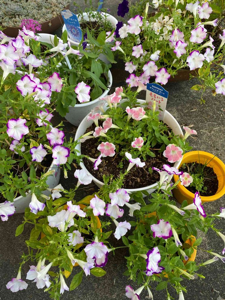 昨夜は台風の影響で雨風がすごかったですが、ガレージで避難のサフィニアアートさんたちは、今日も無事花を咲かせてくれています。切り戻ししたり、挿し芽から育った子たちで、もりもりとはいきませんが。