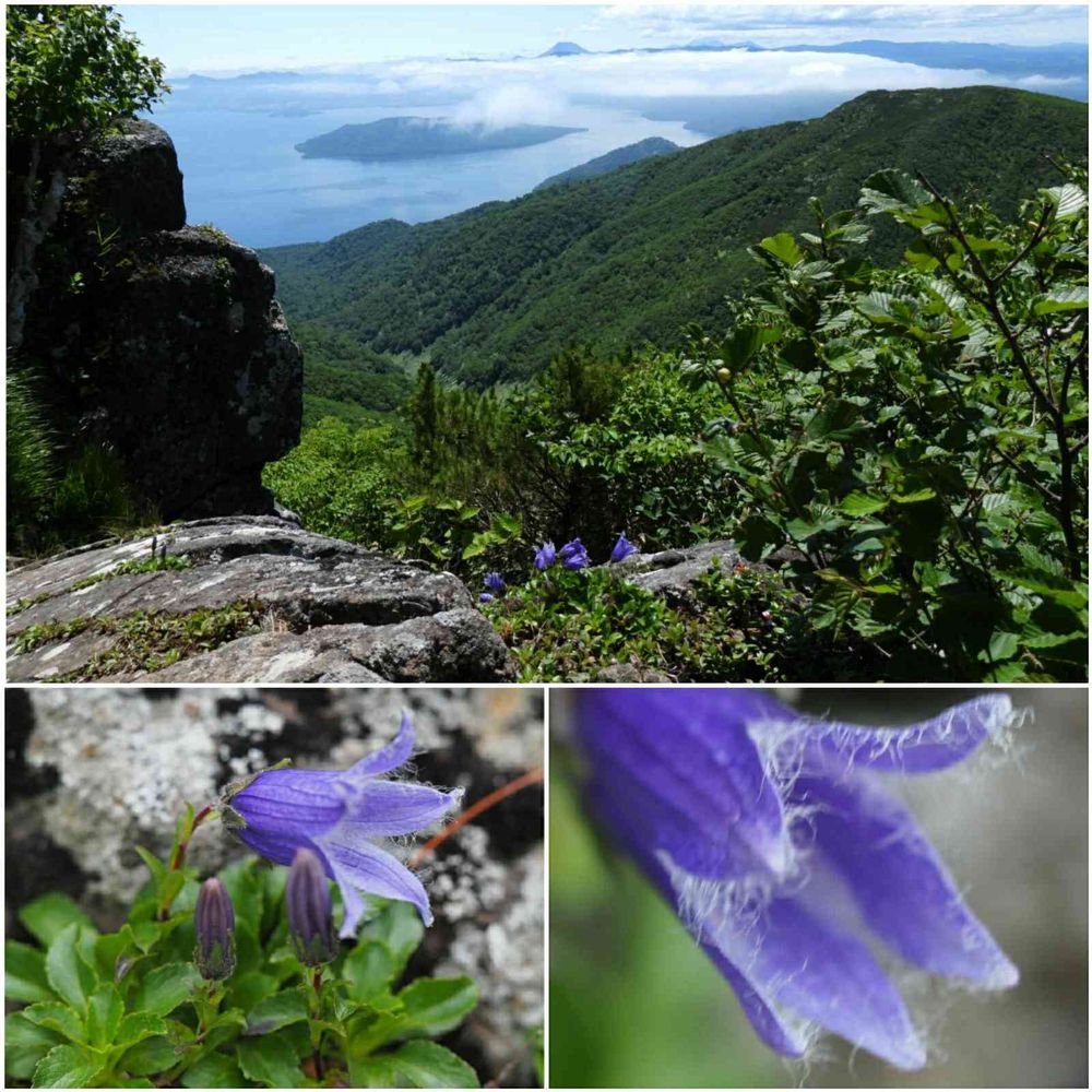 屈斜路湖を見下ろす切り立った岩場に咲くチシマギキョウ。