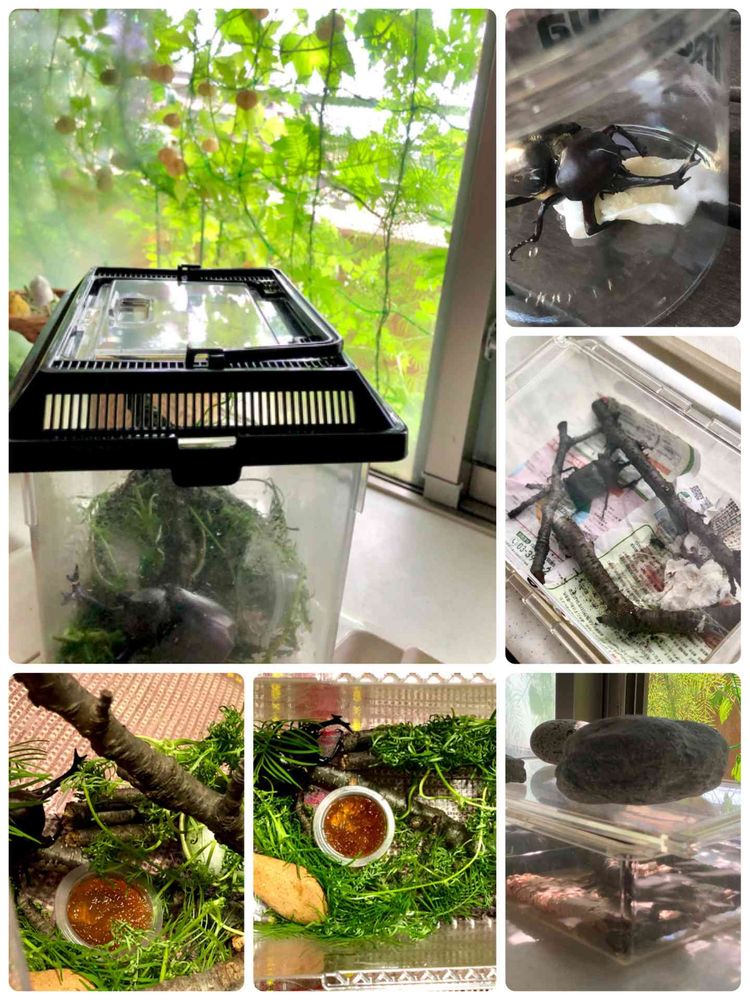 右下の写真のように石をのせておいても、隙間があるとそこからツノや脚を使って蓋を開けてしまうんです😳
