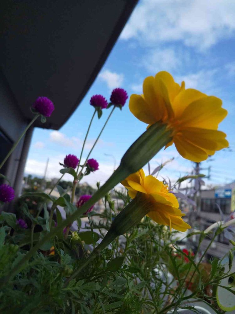 きれいな青い空バックに…マリーゴールド、千日紅さん…