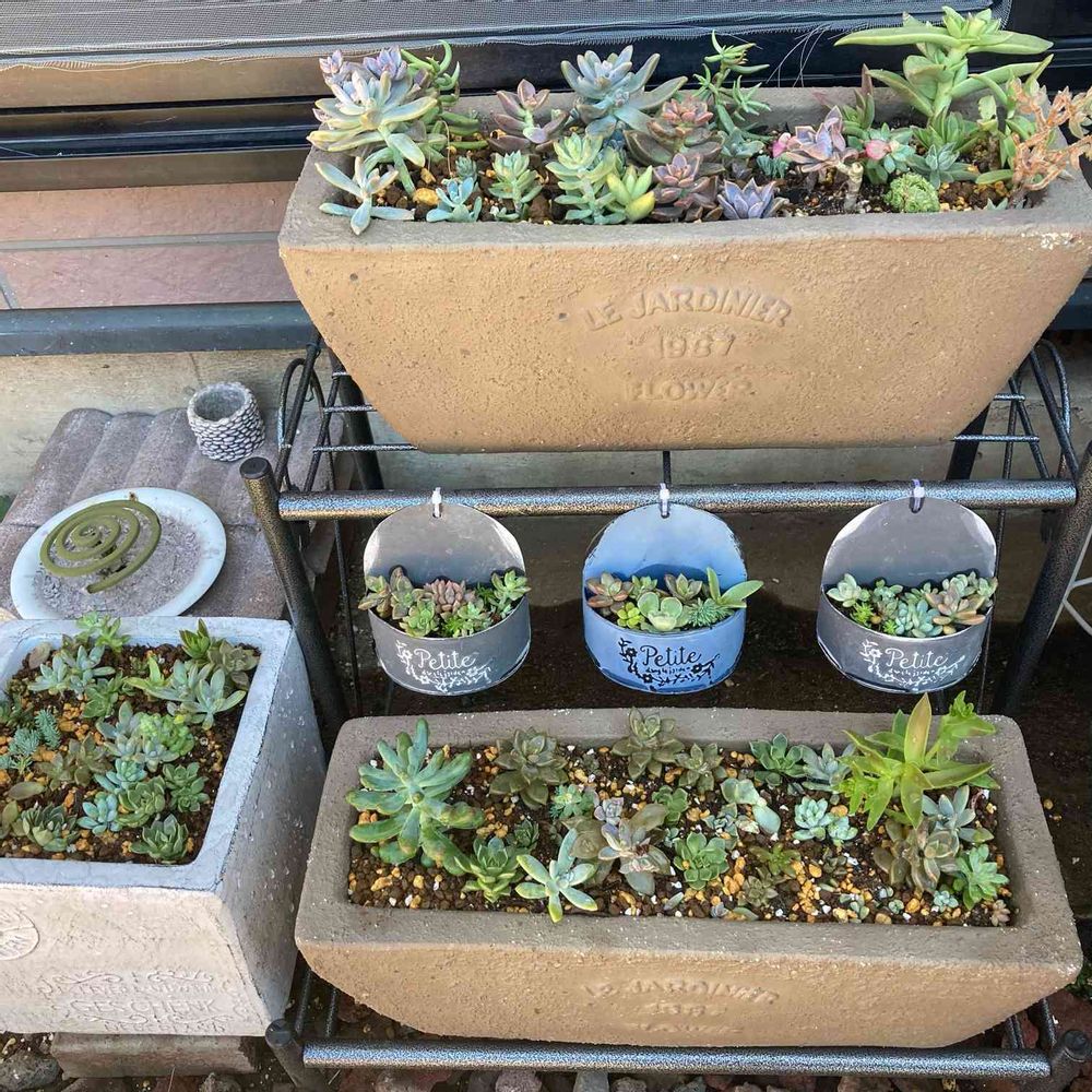 多肉を寄せ植えてた木箱が割れてしまったので、鉢を交換して多肉コーナーをリニューアルしました。