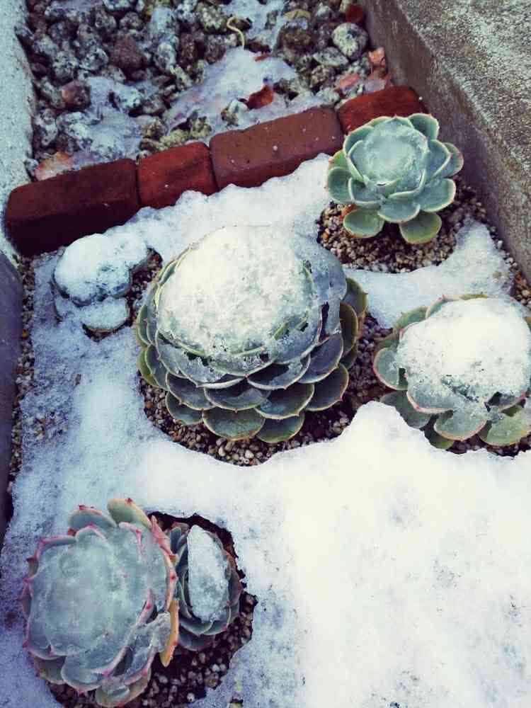 次の日も葉っぱの間が凍ってました(。>д<)💦生け垣に地植えで群生している七福神みたことがあったから、大丈夫だと思って植えたんだけど…