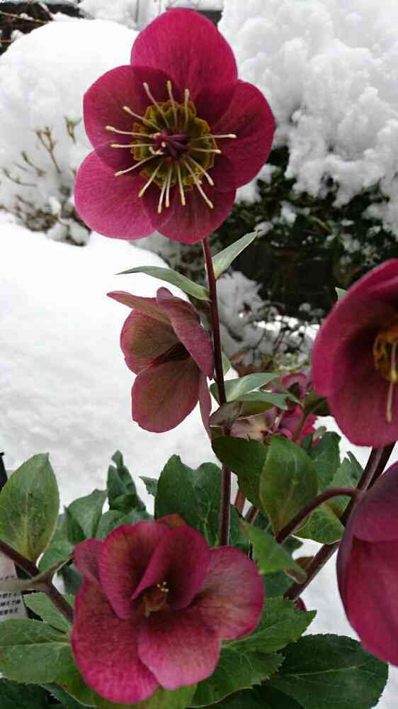 クリロ 本当にたくさんの花があってどれも綺麗ですよね。この色 雪に映えて 花弁が 紅梅のようにもみえます。 見とれてしまいます( ☆∀☆)