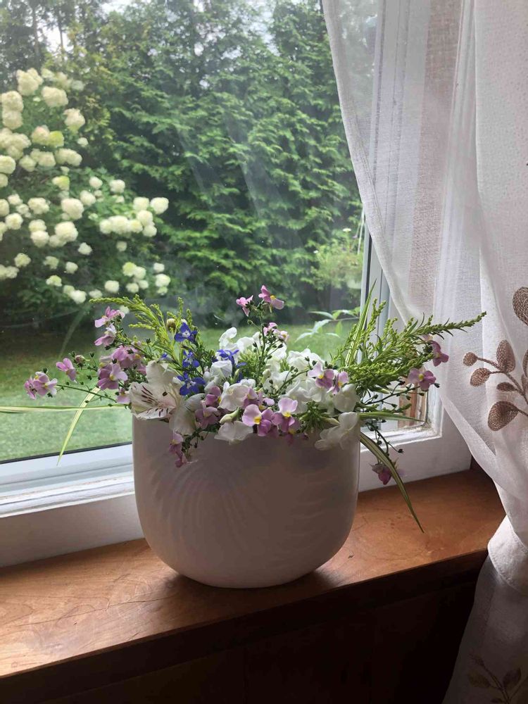 花材: リナリア、ロベリア、ハコネグラス、セイタカアワダチソウ、フロックスアルストロメリア