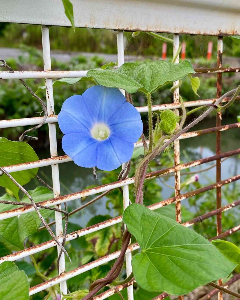 葉が丸いので、マルバアメリカ朝顔かな、錆びた用水のフェンスに絡み付いて、キョトンと、こっちを見ていました🌿🌿