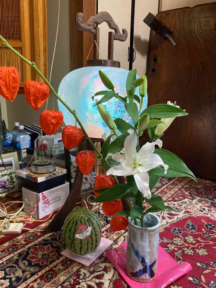 こんにちは。大きなホウズキに、手作り花瓶。お父さんも帰って来てニコニコしていると思います。素麺もあるし^o^。