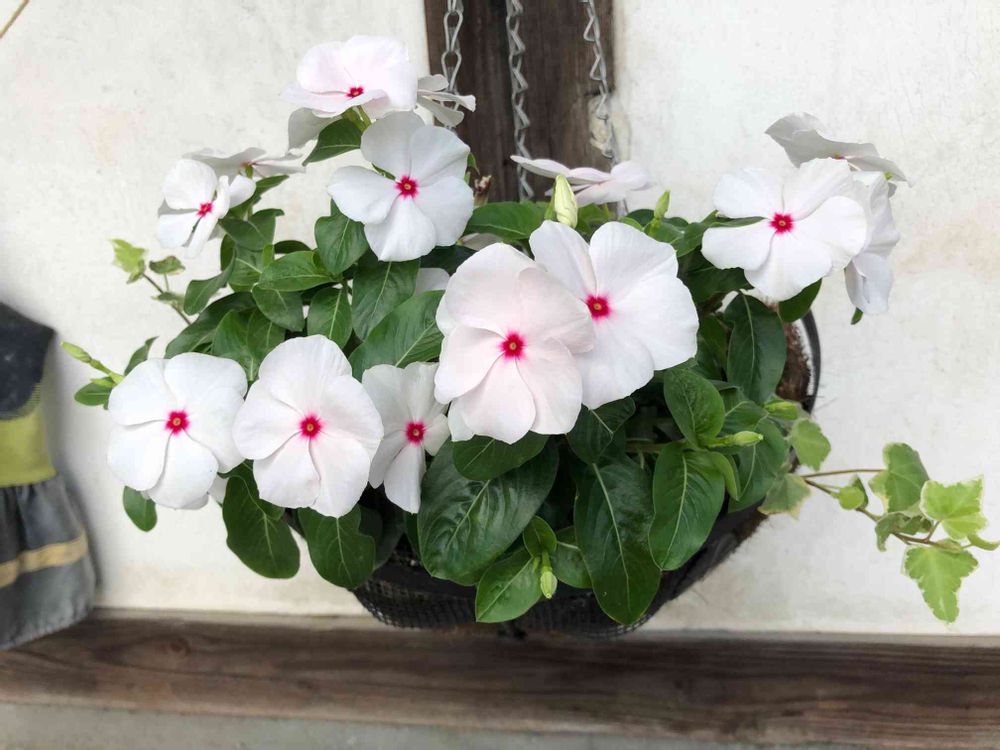6月にニチニチソウとペチュニアを植えて両脇にアイビーを挿したハンギング🌿