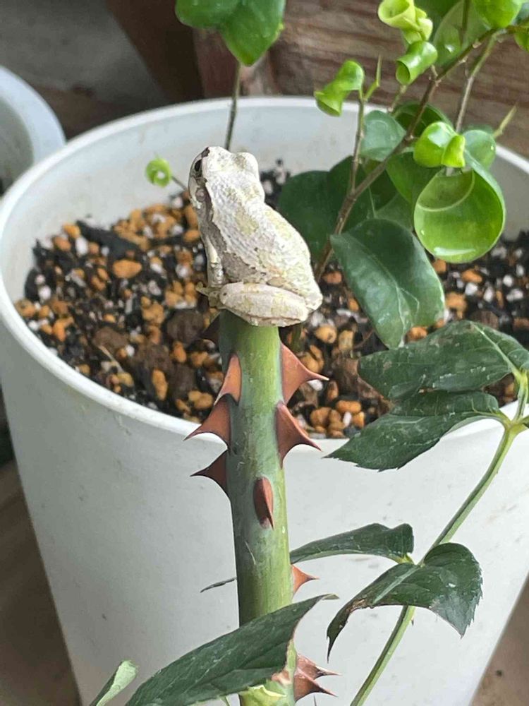 薔薇の挿木のてっぺんに白い雨蛙さん🐸