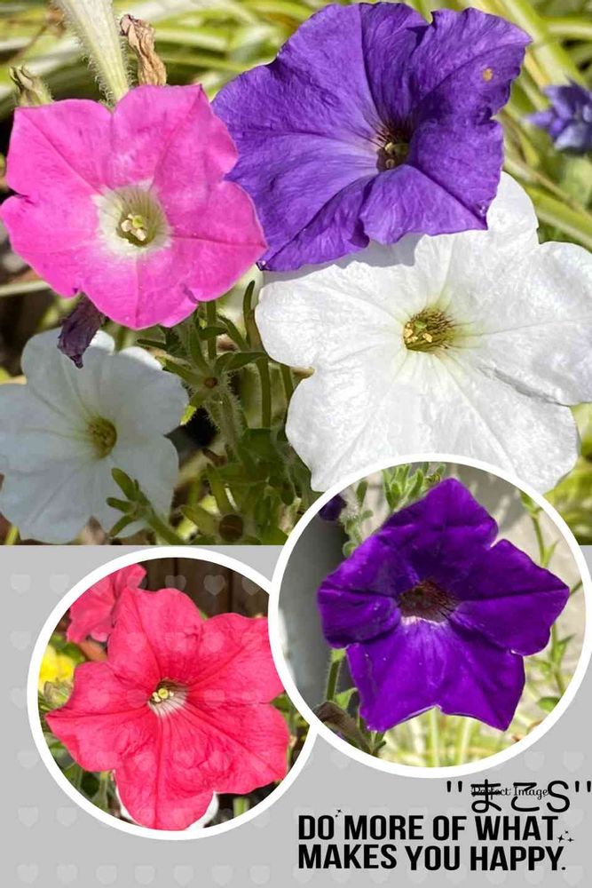 ペチュニアが彩りどり、街路樹の下で咲いています❣️