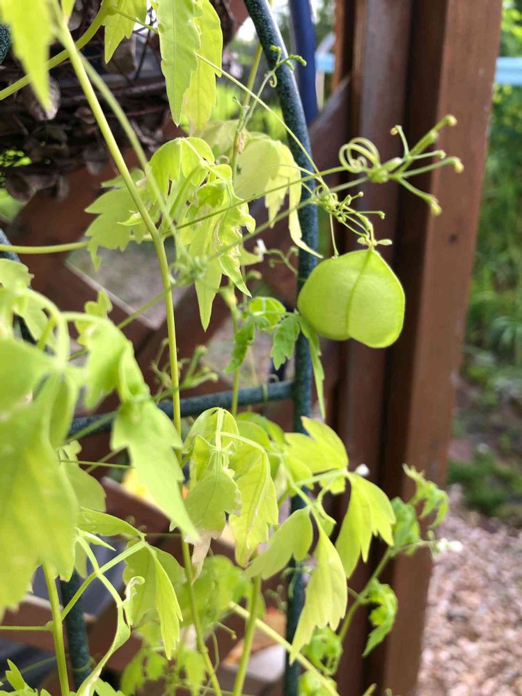 風船かずらがこのサイズで慌てて種を作っています。五つハートの種を収穫しました。小さいので中に一個づつしか入っていません。