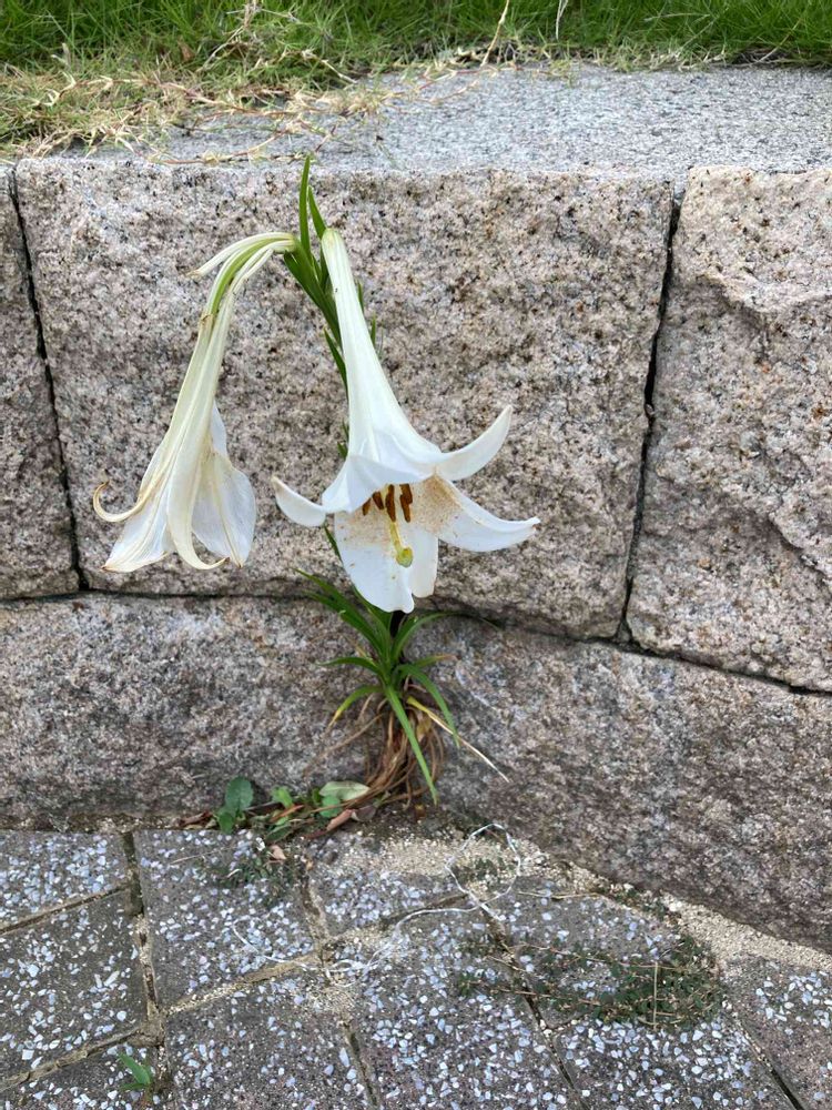 いつも帰り遊んでる公園の外側の石塀の間かテッポウユリが