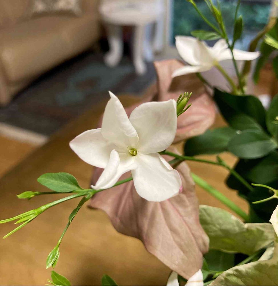 ホワイトジャスミン✨地植えしたらスゴいコトになってしまい、こんなに強い植物だったんですね🌿剪定して、蕾のついた子を花瓶に生けたら、夕方になって、何かいい匂い〜と思ったら、開花してきました🌸