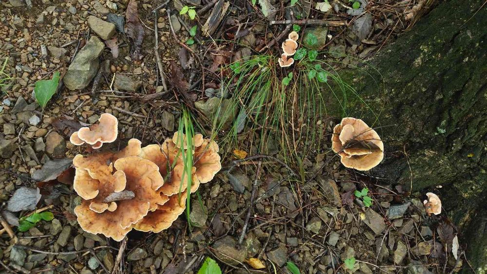 キノコ素人なもので、これはトンビマイタケかな?とも思ったのですが、図鑑を見たらキアシグロタケの方が似ていました。