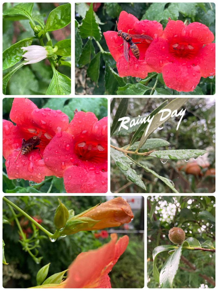 ハチはこの花が好きなのかしら、いつもきていますね。雨宿り?