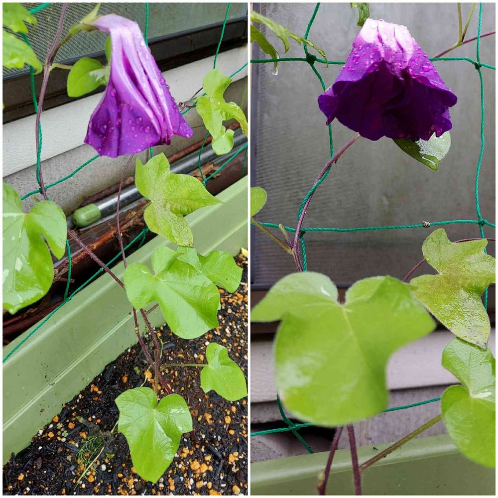 急に気温🌡️が下がって⤵️梅雨☔の様な雨の朝~遅咲きの紫の朝顔フジ💜のお花が咲いたのか❓強い雨に打たれて咲ききれないのか⁉️健気に咲きだした😂🎉