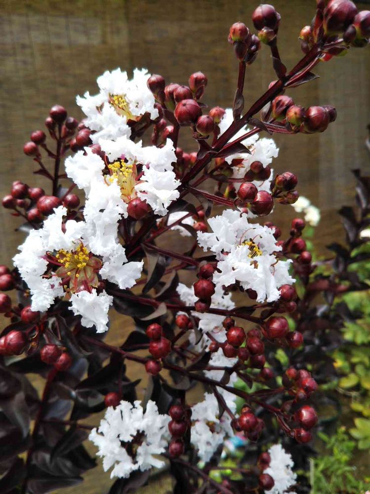 矮性サルスベリ白。やっとやっと、咲き始めました。