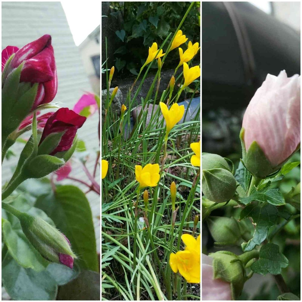 真ん中 キバナサフランモドキ…で良いでしょうか 雨続きにて、今が真っ盛りに咲いてくれています。こぼれ種で増える増える〜
