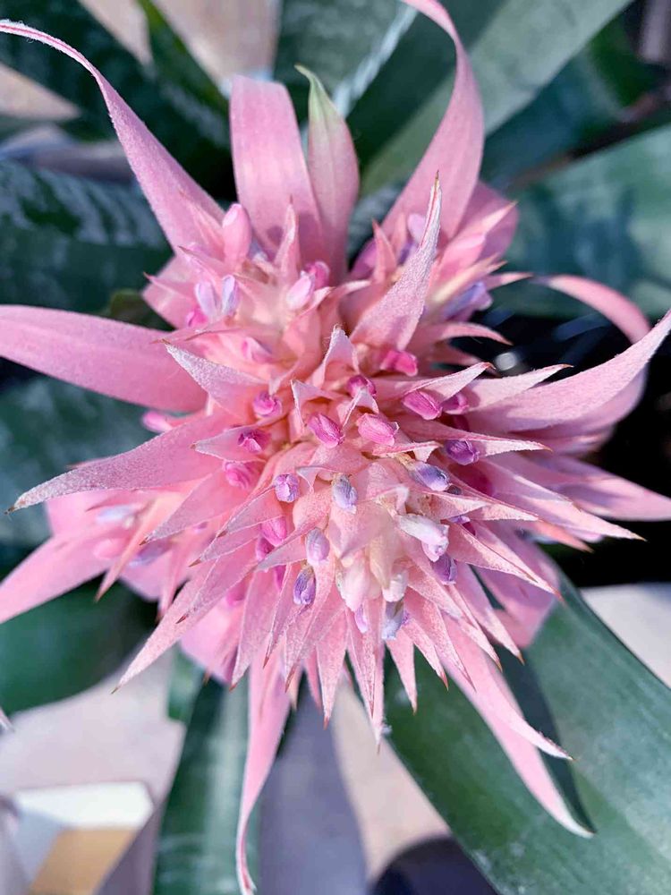 樹木や岩に着生、または地上に根を張る。剣状で硬質の葉が螺旋状につきロゼット状の株になり、株の中心部や葉と葉の間に水を溜め、そこから養水分を吸収して育つ。葉には細かな棘状の鋸歯があり、葉色は灰青緑色で、白っぽく粉を吹いたようなトリコームの横縞虎斑模様が入る。14~16時間の日長で開花が促進される長日植物で、南半球の原産地では12月~翌3月頃、日本では5〜9月頃、ロゼットの中心から花茎を伸ばし、茎頂に桃色の花苞を松かさ状に連ねた広円錐形の花序を作り、苞の中から淡紫色の花を咲かせる。花はすぼまったままで平開せず、3日程の寿命だが、苞は数ヶ月色褪せない。