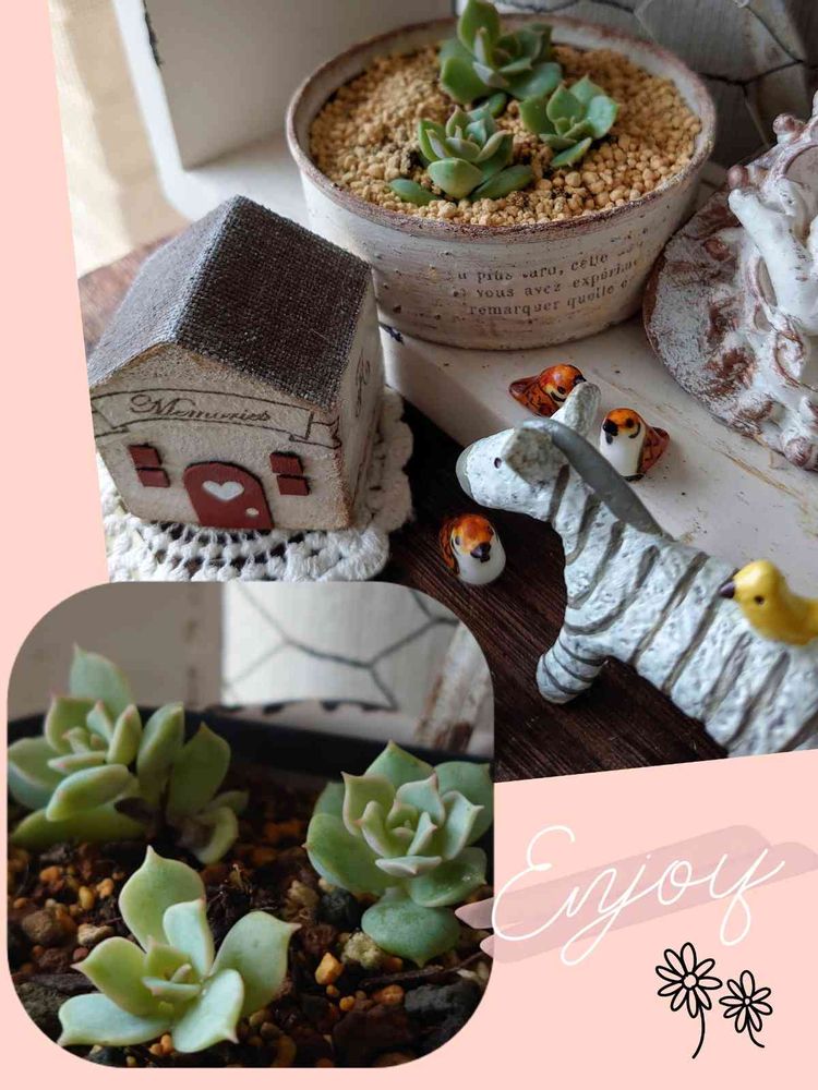 ローラの葉挿しっ子、かわいいリメ缶に植えてもらって可愛さアゲアゲ⤴︎⤴だね💕