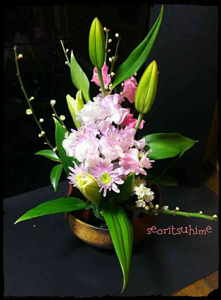 ユリを入れ、スイートピーも入れて仕立て直しです。