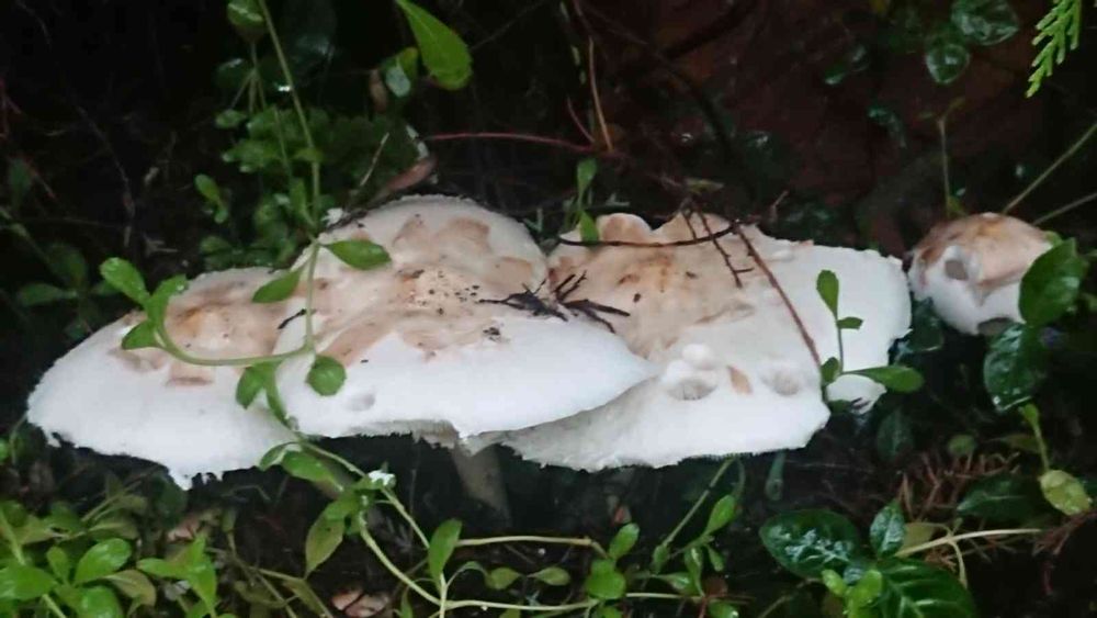 福岡はずっと雨☂️です。今朝グリーンアイスの足元に、こんなにたくさん、白っぽいキノコ🍄が生えていてビックリしました🥺直径10㎝位です。お名前ご存知でしたら、教えてください。