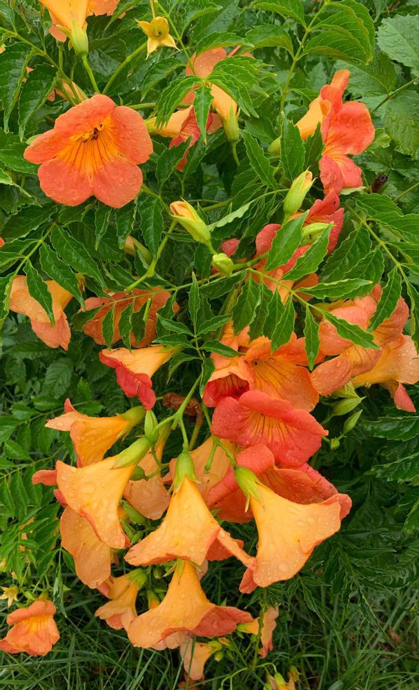 ノウゼンカズラ、パッと目を引く鮮やかな色のお花ですね。青い空が似合うんだけど😣