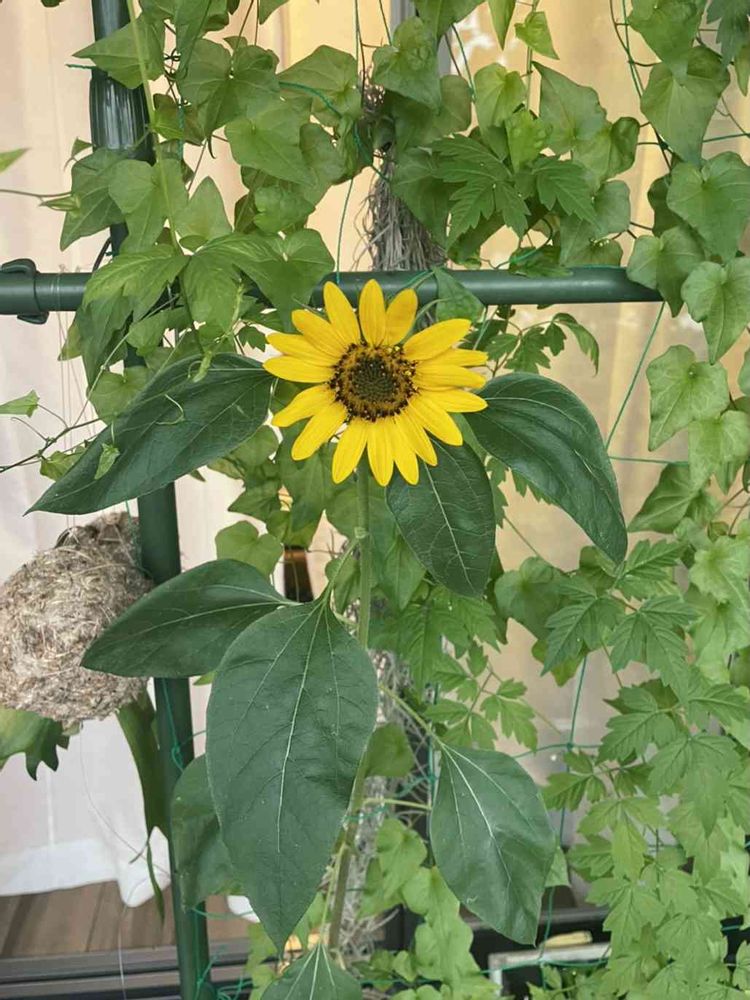 自宅のグリーンカーテンのネットに絡ませておいたヒマワリ🌻も咲いていました♪子供が学校から持って帰ってきたものでヒョロヒョロ徒長してて大丈夫かと心配しておりました😅旦那から咲いていたからと写真送ってくれました☺️✨