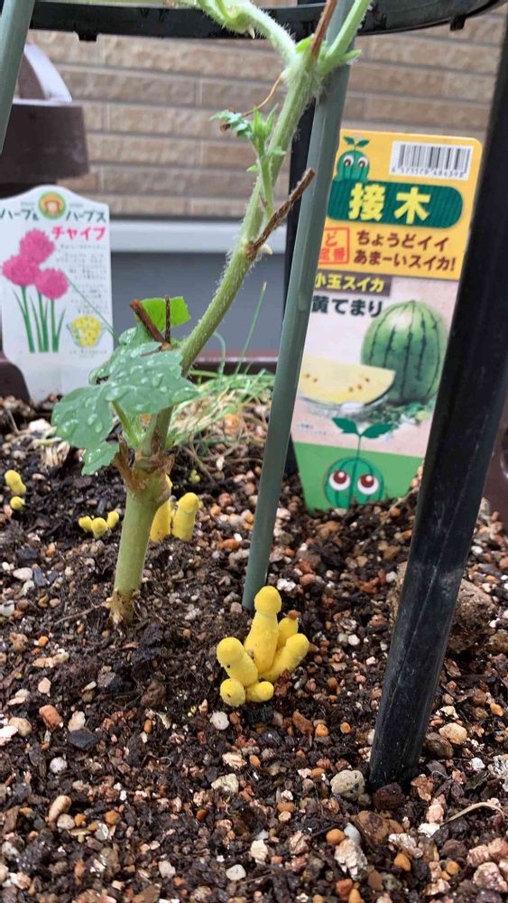 小玉スイカは5cmしか育たなかったけれど、黄色い特別ゲストがいらっしゃいました。根を下ろして暮らしてる?てか、まだまだ出て来そうです。黄色のツブが土から顔出してる。