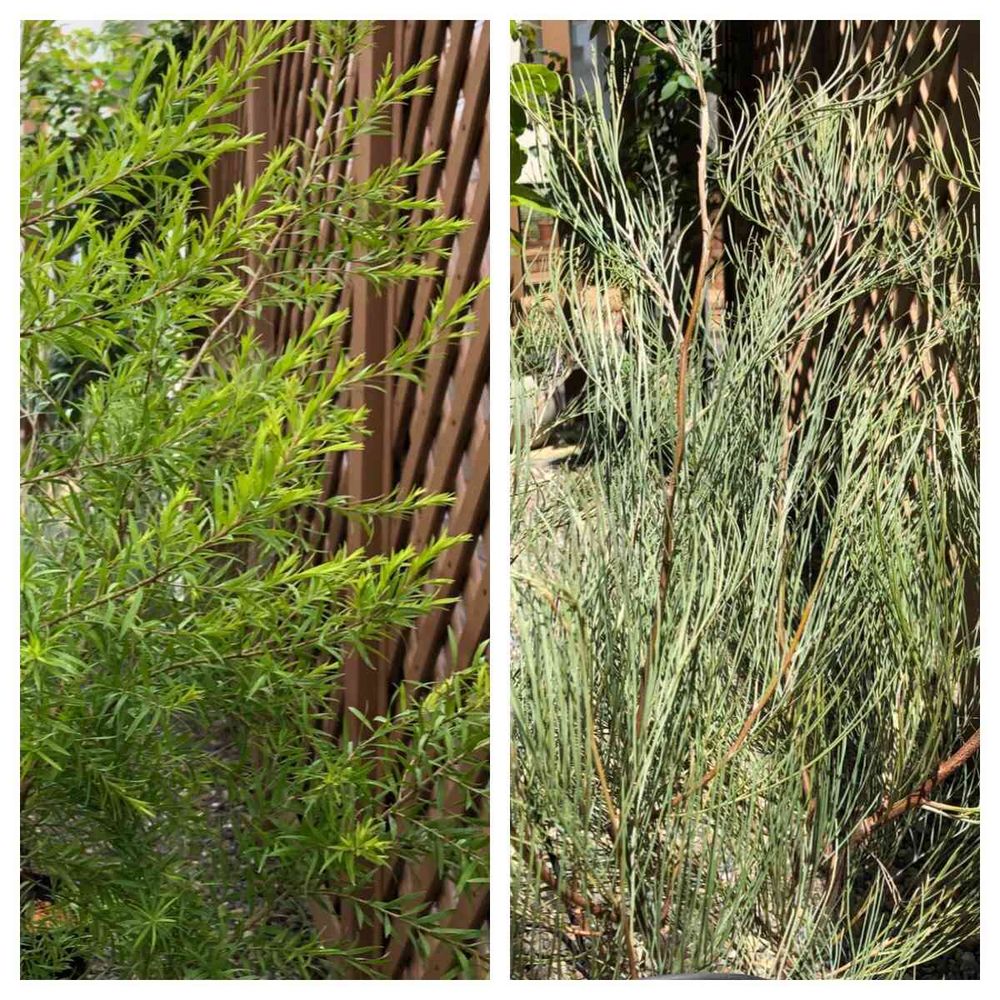 シルバーがかった細葉の美しいグレビレア・キャンデラブロイデス(右)は蛇の目松やアカシア・フェニックスゴールドほど大木にならない細葉の樹木なので、地植え候補にしています🤗