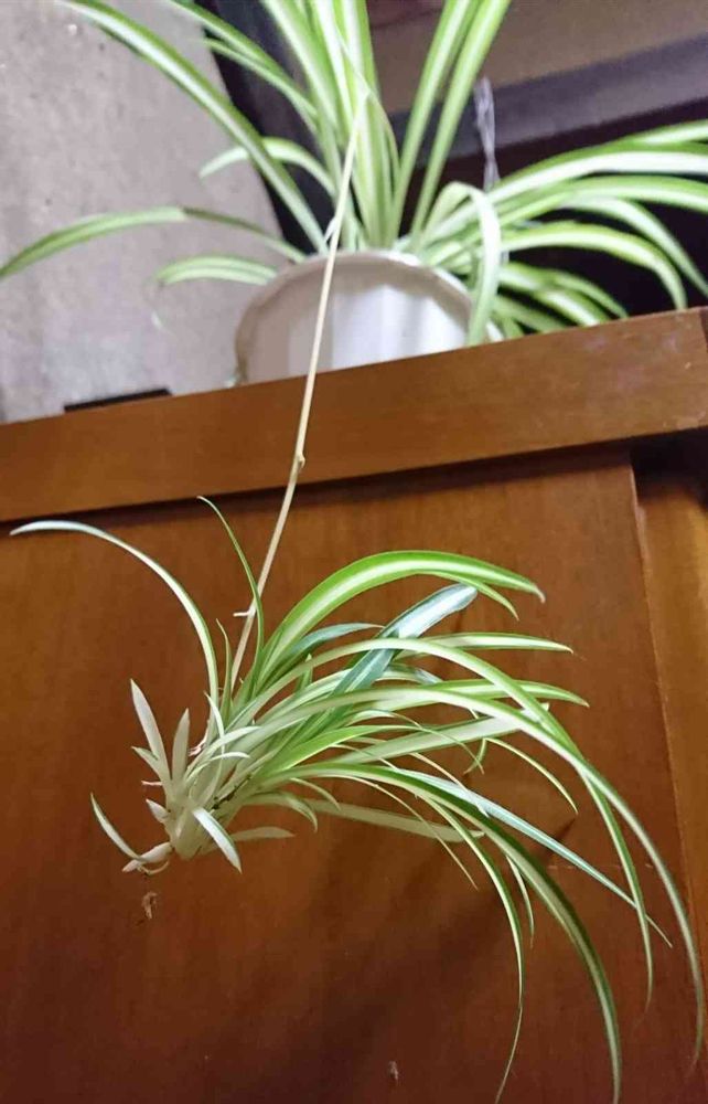 我が家の軒下の棚にいるオリヅルランも、たくさんランナー子株がでています。