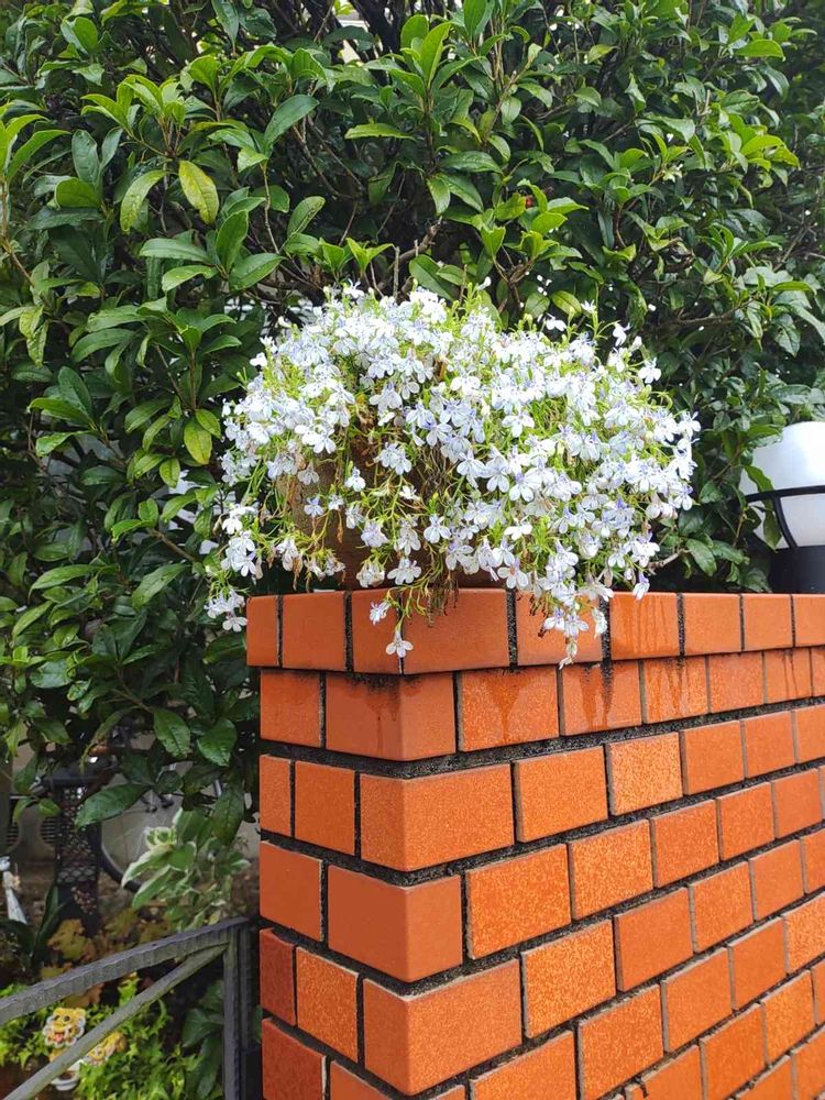 塀の上を飾っているロベリアですが、雨でしょんぼり。