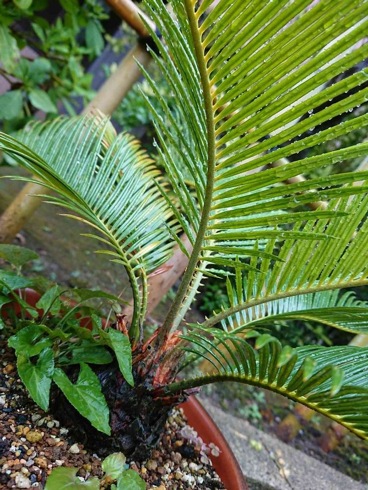 蘇鉄って太陽も似合うけど雨も凄く似合うよね~!冬の寒さで葉っぱ汚かったのに、梅雨辺りからグングン調子出始めたよ👍✨