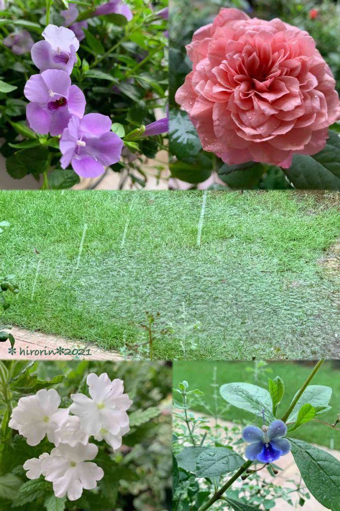 雨が白い線状に写るほど激しく降っています。軒下で避難しているお花を少し…