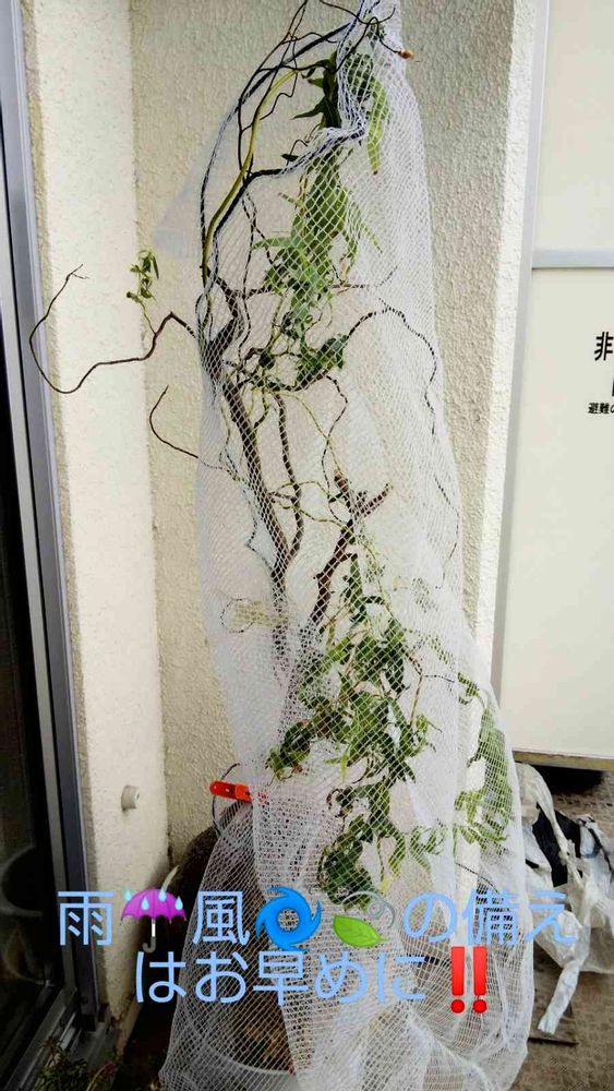 この雲龍柳も風除けに入っていますが、葉っぱ🌿にダメージ🩹が出るレベルなので、防風ネットをかぶせました。