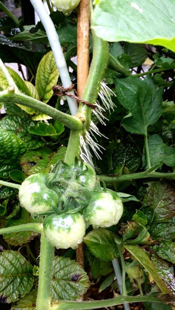 梅雨の時期、うちのミニトマトにもいっぱい出てきて、ビックリしました。気根とか呼ばれるそうで、雨が止んで乾燥してきたら、出なくなりました。ご機嫌がいい時は出ないので、やっぱり〝雨はもうたくさん💦〟のサインみたいです。