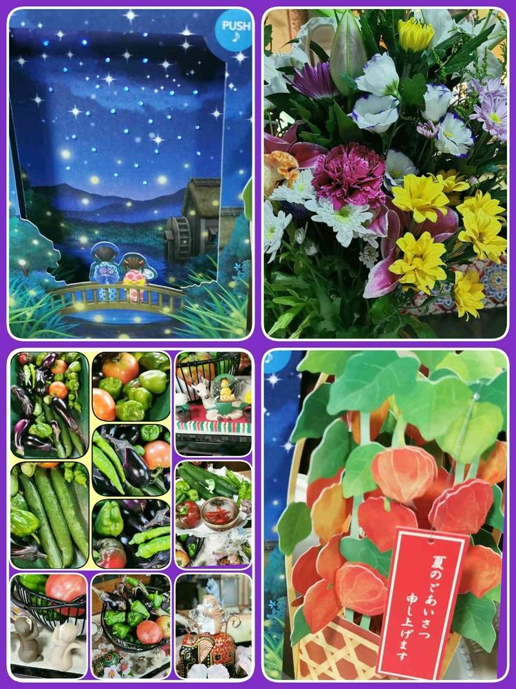 沢山の夏野菜、お花、ホウズキ、夏の夜空