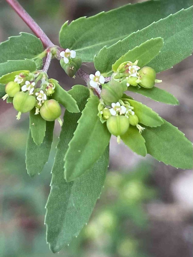 大錦草。北米原産の帰化種。日本在来種の錦草は茎が赤、葉が緑で江戸時代に錦に喩えたようだ。トウダイグサ属の大錦草も茎は赤く、直上するか斜めに立ち上がる。同属の錦草や帰化種の小錦草は地を這うので、ここで見分ける。
