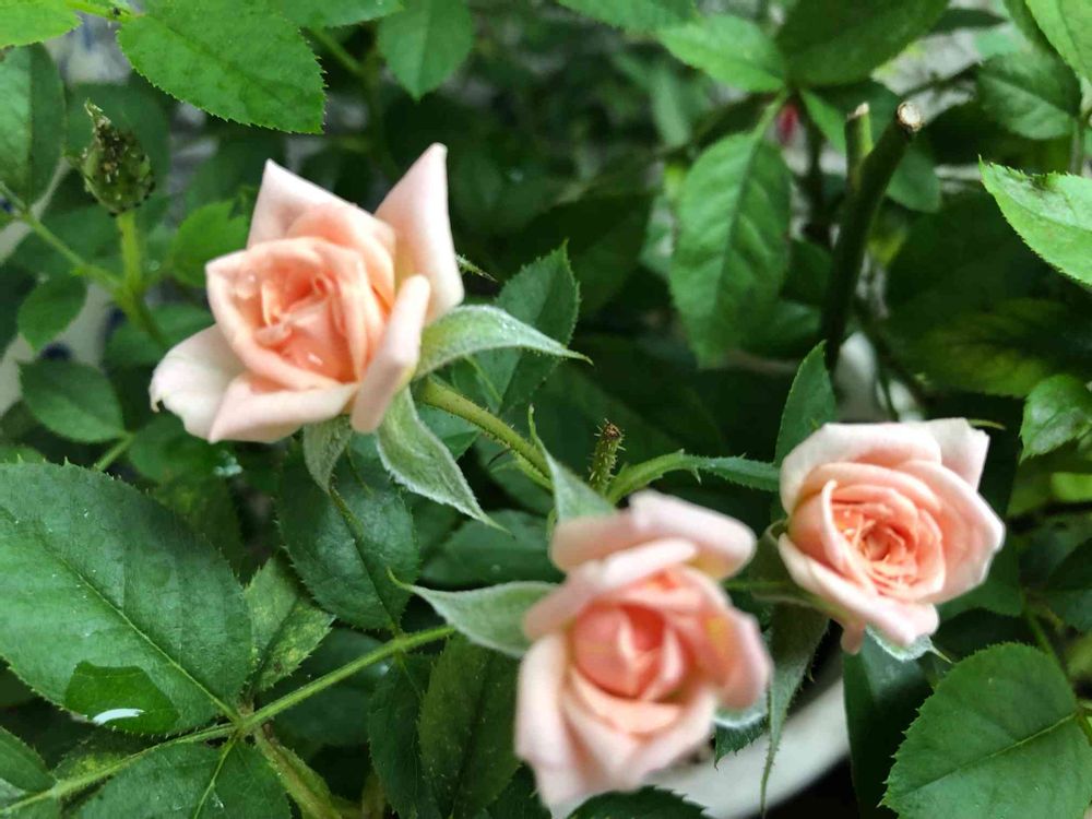 お花達の中でも「みーちゃんの薔薇」と呼んで特別扱い。雨の中軒下避難中。うちは軒下が玄関先しかないので、他のお花達ごめんね〜。びしょびしょだけど頑張れ〜。