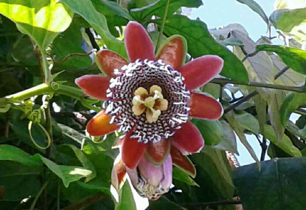 トケイソウでもトップクラスのハデさですよねー。これ、香りもいい花で、実付きが悪いけど果実も大型のパッションフルーツとして食べられます。見てよし、香りよし、食べてよしの三拍子揃った観賞兼用果樹です。