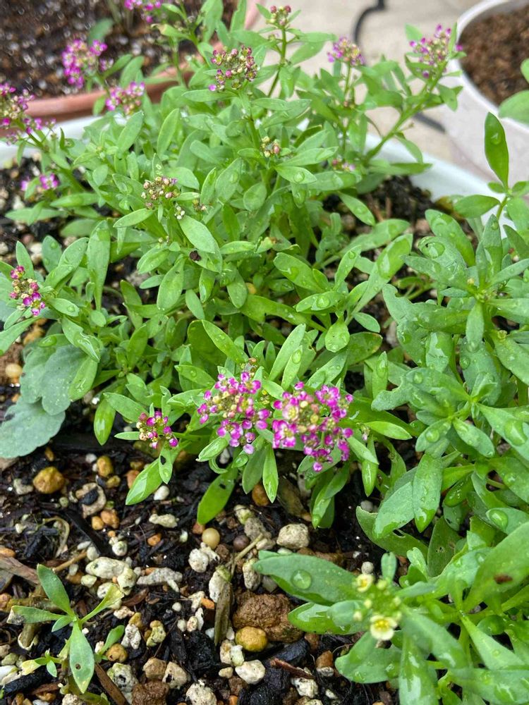 虫食いでしょぼしょぼだった養生中のアリッサムに赤紫の花が!手前にはレモン色の花らしきものもちらっと。がんばってほしい!