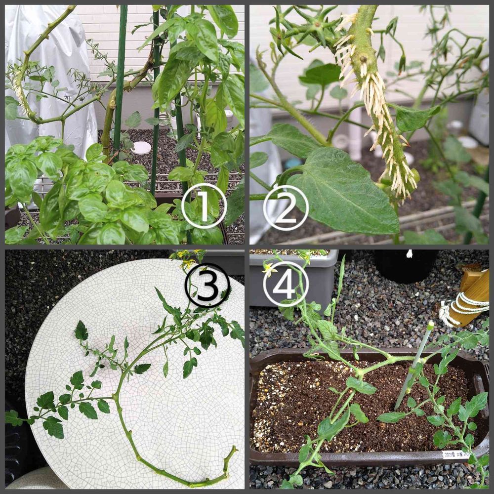 連日の大雨ですっかり実も落ちて、茎から根っこも生えてきたので、思い切ってミニトマトの仕立て直し(?)というか挿し芽をしました🍅