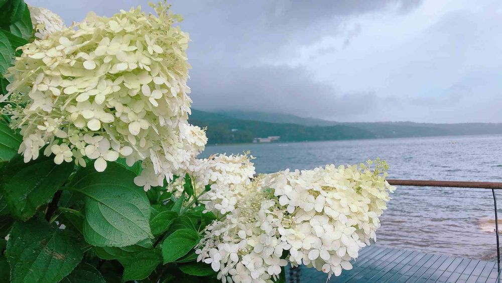 湖畔に咲いているピラミッドアジサイ(ノリウツギ)です。