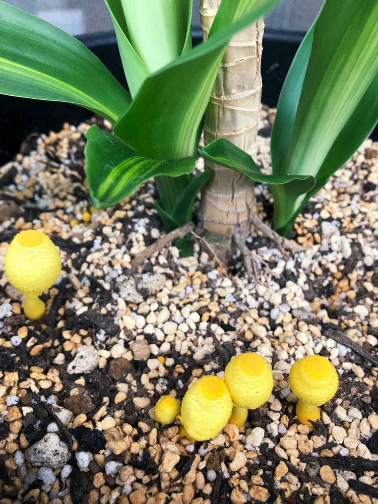 へ〜、用土に黄色いキノコが生えるんだぁ