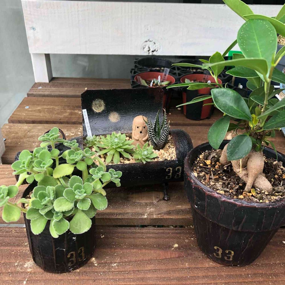 「家出る時2〜3鉢貰って行くから…シンプルな黒鉢でヨロシク👍」と長男氏に言われてたので…ずーーっとお世話して来た子達。やっと取りに来たwガジュマル君なんて枝切り落として坊主からここまで…愛着しかない(T ^ T)…ので母は新たなガジュマル君お迎えして育てております✨
