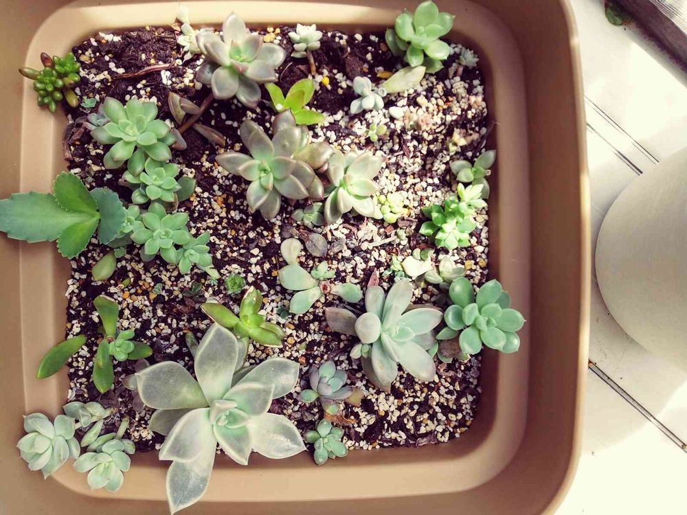 ブロンズ姫丼したいけど、それほど数がない。他にも葉挿しっ子がいろいろ。子宝草は増える増える(笑)