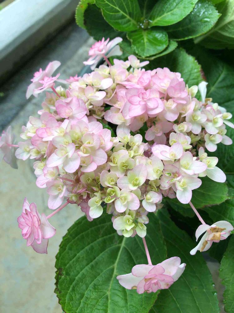 2021-8-16(月)雨☔️ picのガクアジサイひな祭りは鉢植え🪴の毎回同じ花房です。梅雨に戻ったような気温の中で咲いています。