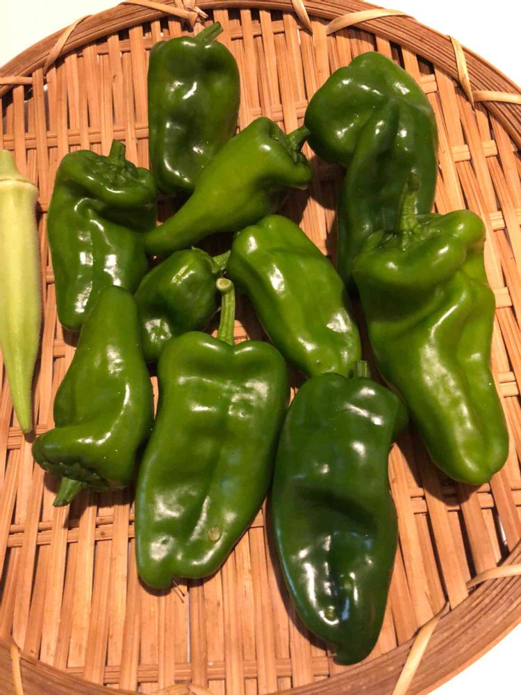 追加、晩御飯の惣菜、麻婆茄子のピーマン収穫。今朝のパプリカ🫑の赤と🍆で。